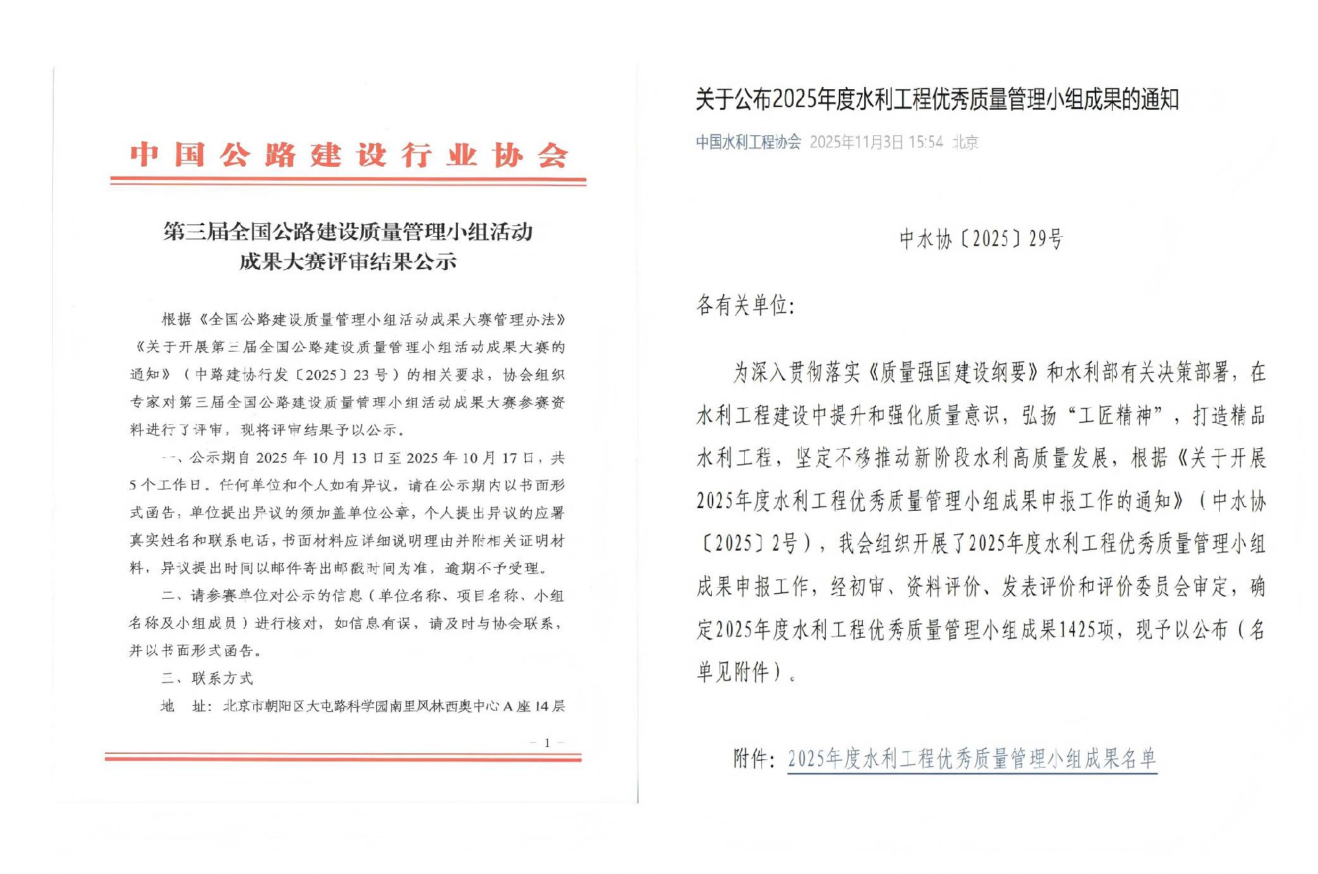 近日,中國公路建設(shè)行業(yè)協(xié)會(huì)、中國水利工程協(xié)會(huì)先后公布了第三屆全國公路建設(shè)質(zhì)量管理小組活動(dòng)成果評(píng)審結(jié)果和2025年度水利企業(yè)質(zhì)量管理小組競賽活動(dòng)結(jié)果?!啊ぁぁ?/p>